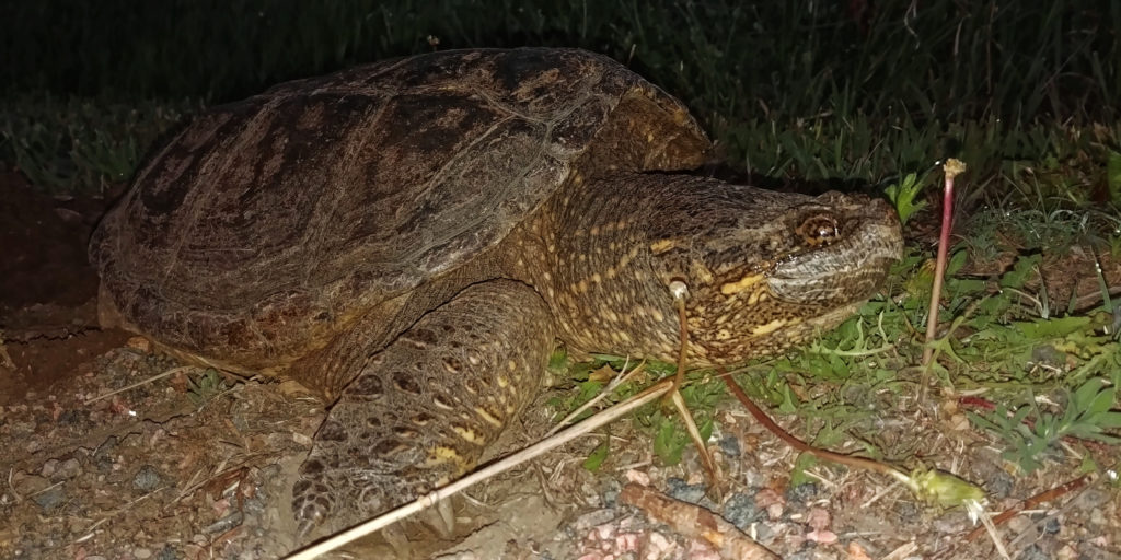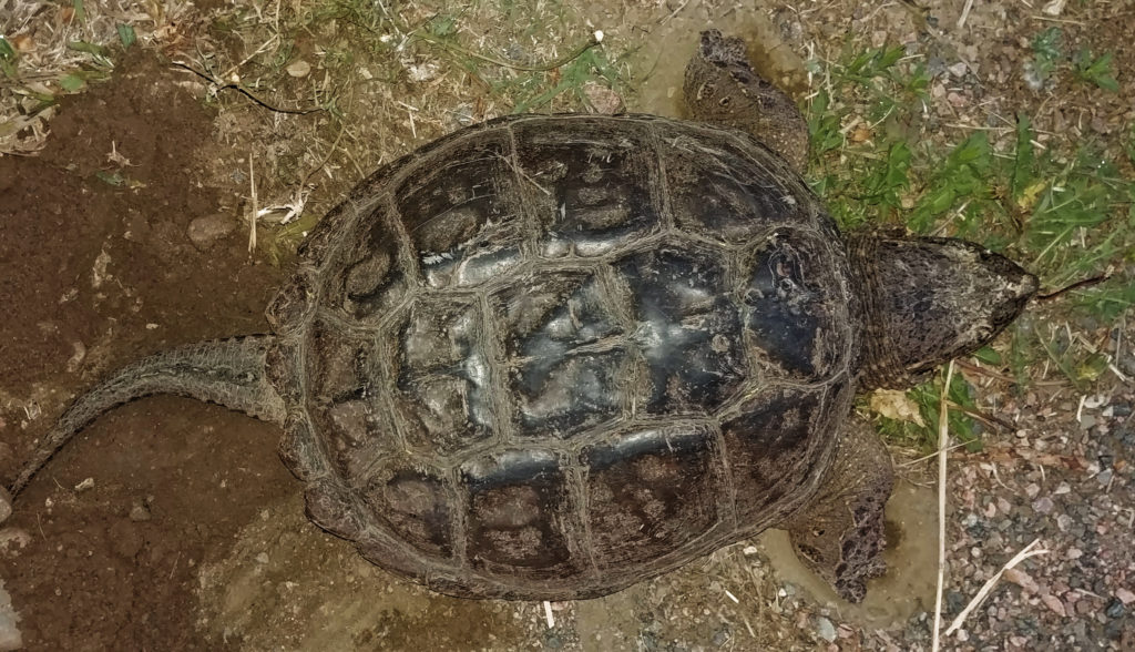 June 12, 2020 This turtle seemed to be building a nest along the Coal Creek trail in Lafayette, Colorado, USA It was really large for living in such a small creek–as big as a dinner plate